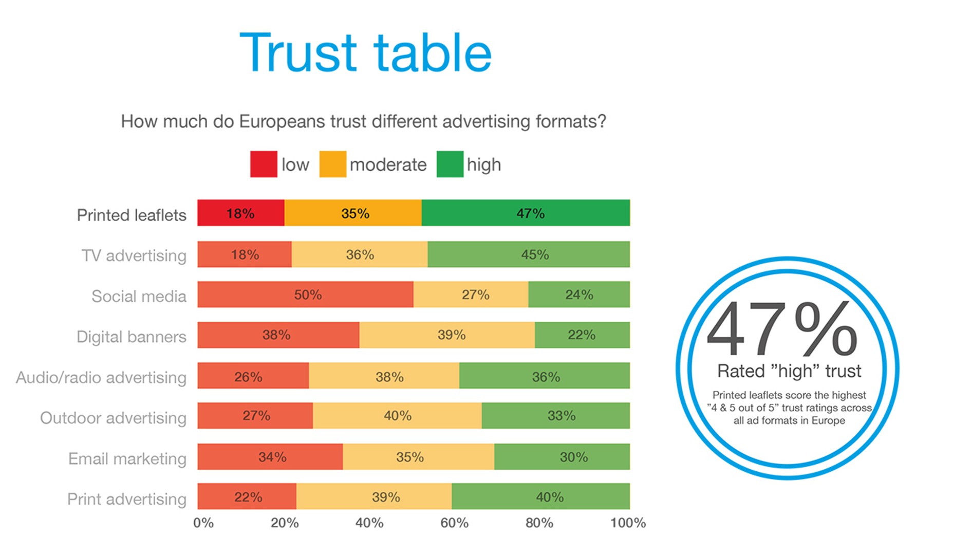 47% anger att de har högt förtroendeför fysisk direktreklam – vilket är betydligt bättre betyg än för t.ex. TV, sociala medier och andra digitala kanaler. - Riktig uppmärksamhet